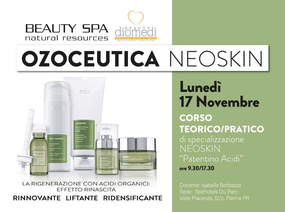 Una giornata full immersion dedicata alle proprietà rigeneranti degli acidi organici e al potere bio-dinamizzante dell’olio ozonizzato presenti nella linea viso Neoskin targata Beauty Spa. La specializzazione nell’uso di acidi ti permetterà di regalare ai clienti una nuova pelle del viso grazie alla risoluzione di criticità cutanee come rughe profonde, cedimento dell’ovale, anelasticità, invecchiamento precoce, macchie e pori dilatati, pelle affaticata dalla fase pre o post menopausa, esiti cicatriziali.